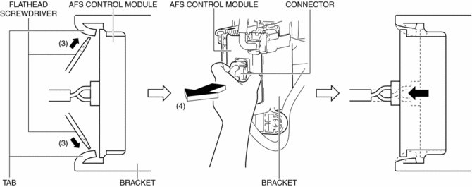 6. While pressing the bracket tab in the direction of the arrows (3) shown in the figure using a tape-wrapped flathead screwdriver, hold the connector, pull out the AFS control module in the direction of the arrow (4) shown in the figure to detach the bracket tab and AFS control module.