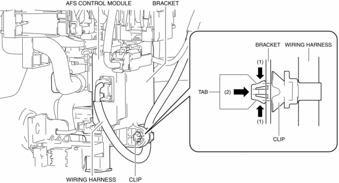 Because the AFS control module cannot be removed with the clip installed to the bracket, remove the clip from the bracket to allow for a margin length in the wiring harness.