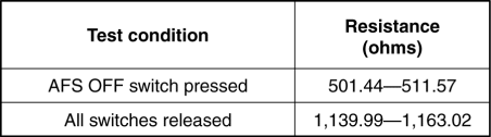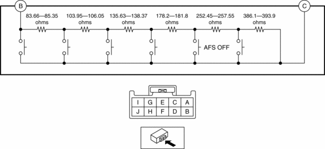 3. Verify that the resistance between AFS OFF switches B and C is as indicated in the table.