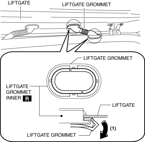 17. Partially peel the liftgate grommet in the direction of arrow (1) shown in the figure, and remove the liftgate grommet from the liftgate grommet inner. (with SIRIUS satellite radio system)