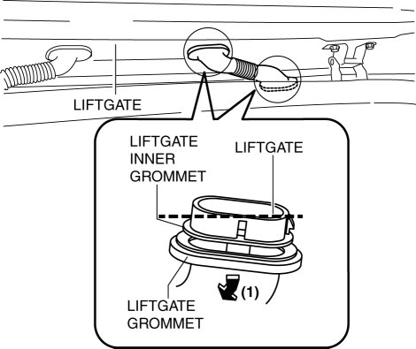 19. Pull the liftgate grommet in the direction of the arrow (1) shown in the figure and remove it.