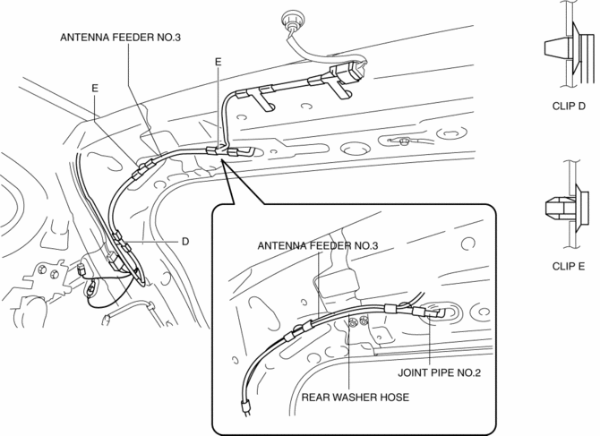 20. Pull out the disconnected connectors of the liftgate side and vehicle interior side and antenna feeder No.3. (with SIRIUS satellite radio system)