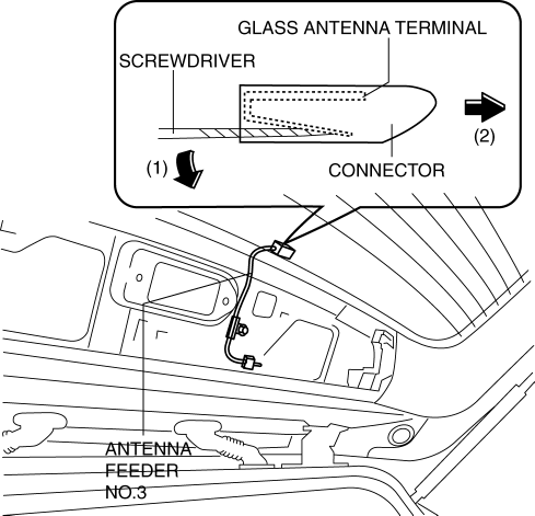 13. Using a screwdriver wrapped in protective tape, pull the connector in the direction of the arrow (2) shown in the figure while pressing glass antenna terminal in the direction of the arrow (1) shown in the figure, and disengage the glass antenna terminal from the connector. (with SIRIUS satellite radio system)