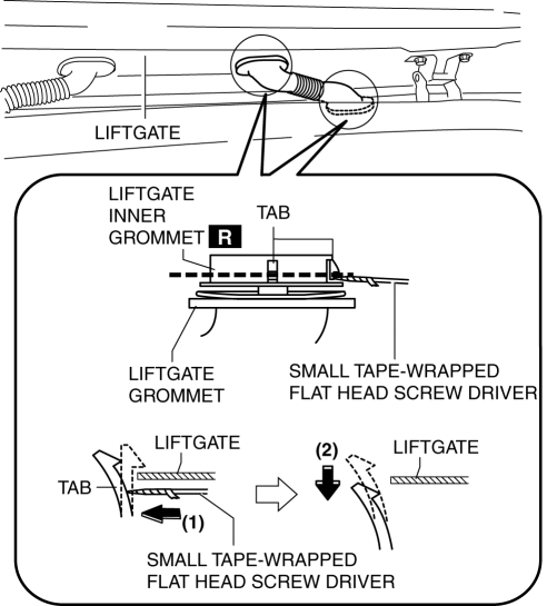 18. Using a screwdriver wrapped in protective tape, pull the liftgate grommet in the direction of the arrow (2) shown in the figure while pressing the liftgate grommet inner tab in the direction of the arrow (1) shown in the figure, and disengage the liftgate from the liftgate grommet. (with SIRIUS satellite radio system)