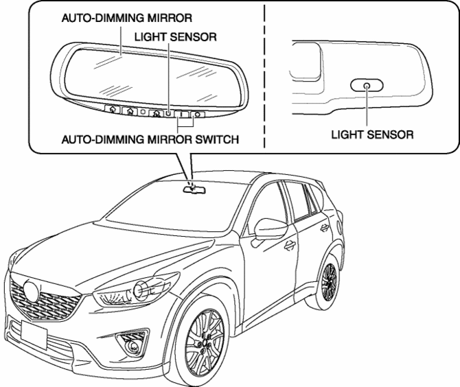 The automatic glare prevention rearview mirror detects the level of the surrounding light and glare from vehicles at the rear using the light sensor.
