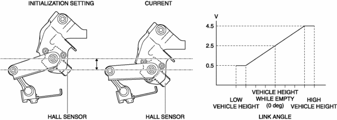 2. The auto leveling sensor fluctuates the vehicle height value based on the link angle, and outputs the vehicle height signal to the AFS control module.