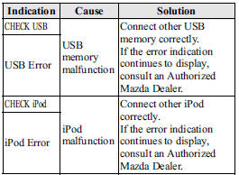 If the message “CHECK iPod” is displayed, it indicates that there is a malfunction in the iPod. Verify that the content recorded in the iPod has playable files and connect correctly. If the message reappears, have the unit checked by an Authorized Mazda Dealer.
