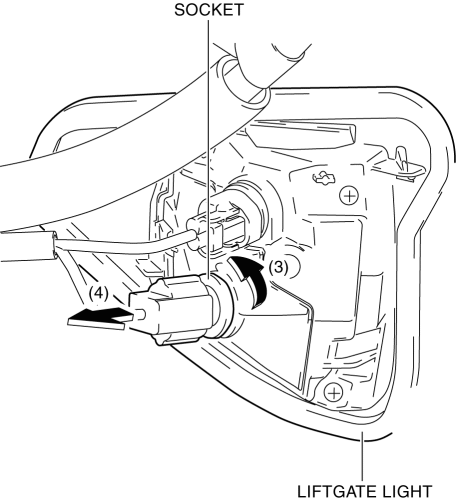 6. Rotate the socket in the direction of the arrow (3) shown in the figure and remove it from the liftgate light in the direction of the arrow (4) shown in the figure.