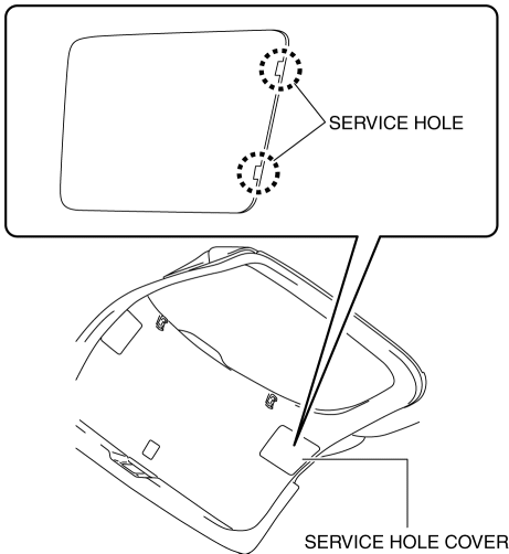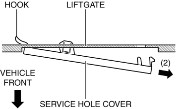 4. Pull out the service hole cover in the direction of the arrow (2) shown in the figure and pull out the service hole cover hook from the liftgate.