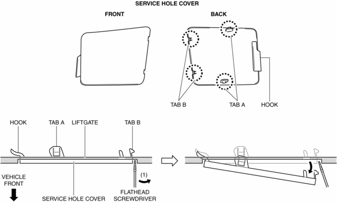 3. Move the flathead screwdriver in the direction of the arrow (1) shown in the figure, pull out the service hole cover from the liftgate, and detach the service hole cover tabs and liftgate connections.