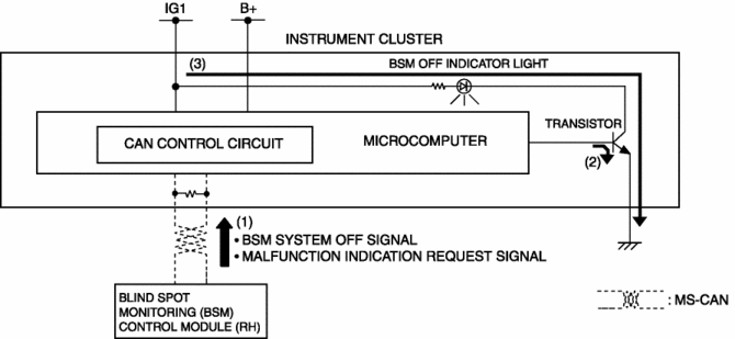 The instrument cluster receives (1) the BSM system off signal or malfunction indication request signal from the BSM control module (RH) via the CAN signal.