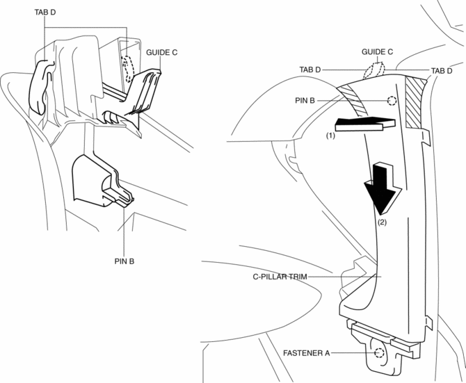 6. Remove the C-pillar trim in the direction of the arrow (2) shown in the figure while detaching guide C, tabs D.