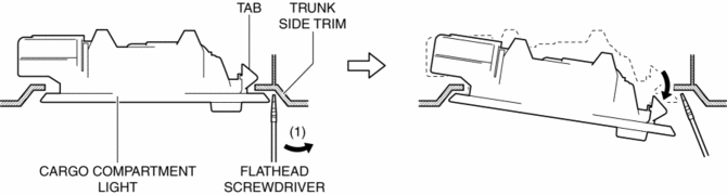 4. Move the flathead screwdriver in the direction of the arrow (1) shown in the figure, pull out the cargo compartment light from the trunk side trim, and detach the cargo compartment light tab and trunk side trim.
