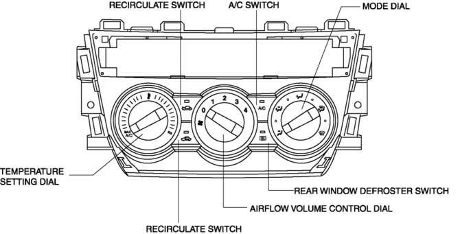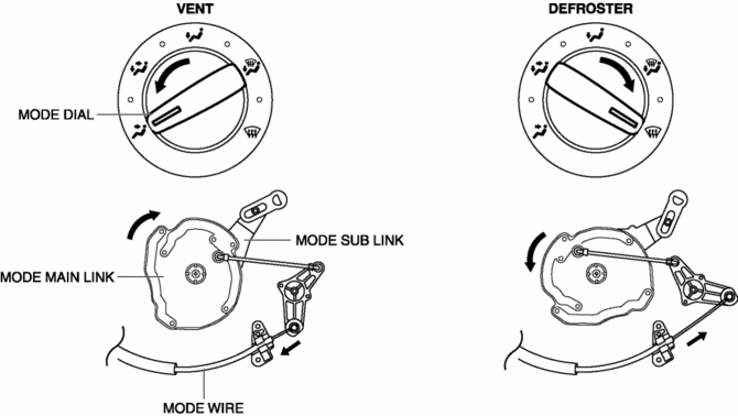 When the mode dial is turned, the length of the airflow mode wire is changed, and the airflow mode door position is switched via the airflow mode main link and the airflow mode sub link. As a result, the airflow mode is changed..