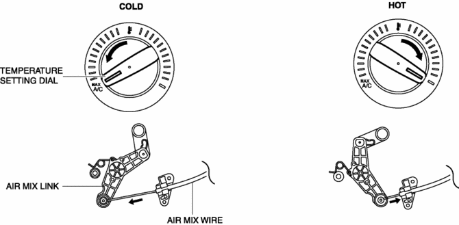 When the temperature control dial is turned, the length of the air mix wire is changed, and the air mix door position is switched via the air mix link. As a result, the blower air temperature is changed..