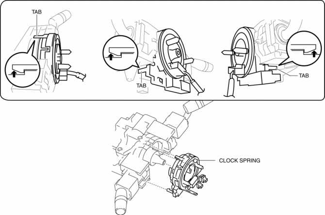 If the clock spring is not adjusted, the spring wire in the clock spring will break due to overtension when the steering wheel is turned. Always adjust the clock spring after installing it.