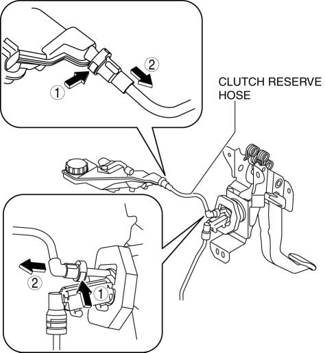 4. Remove the clutch reserve hose while pressing the point indicated by the arrow in the figure.