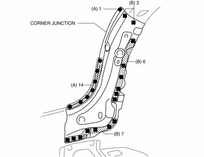 5. Plug weld the 15 locations indicated by (B) shown in the figure, then install the corner junction.