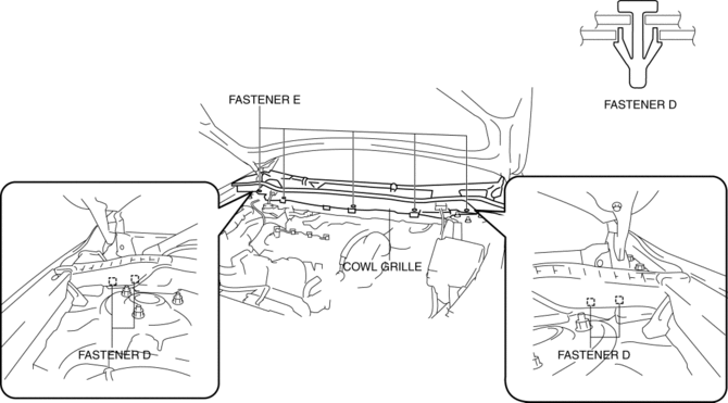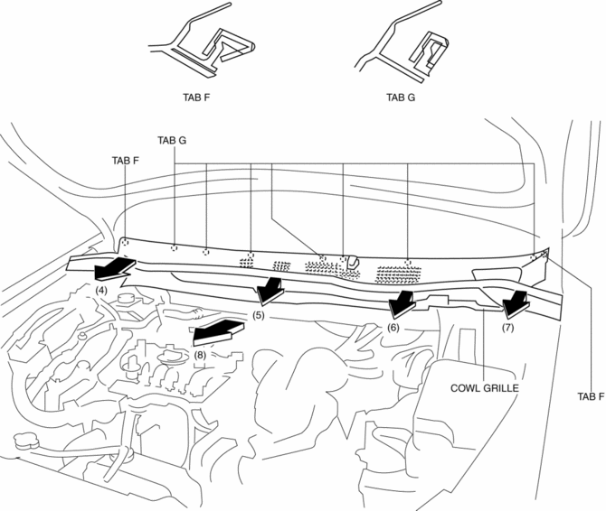 8. Pull the cowl grille in the direction of the arrow in the order of (4), (5), (6), (7), (8) and remove it while detaching tabs F, tabs G.