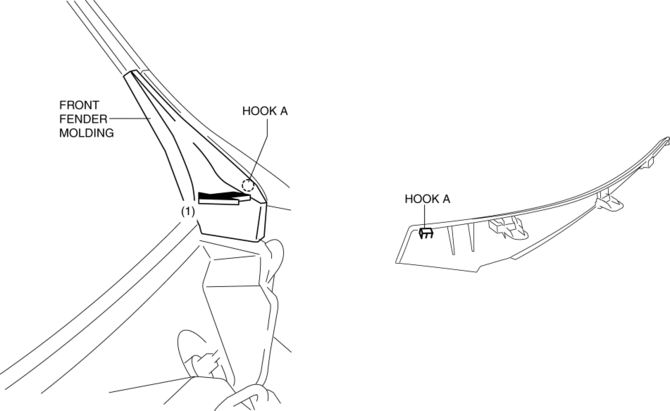 2. Pull the front fender molding in the direction of the arrow (1) while detaching hook A.