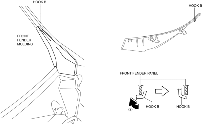 3. Pull the front fender molding in the direction of the arrow (2) while detaching hook B.