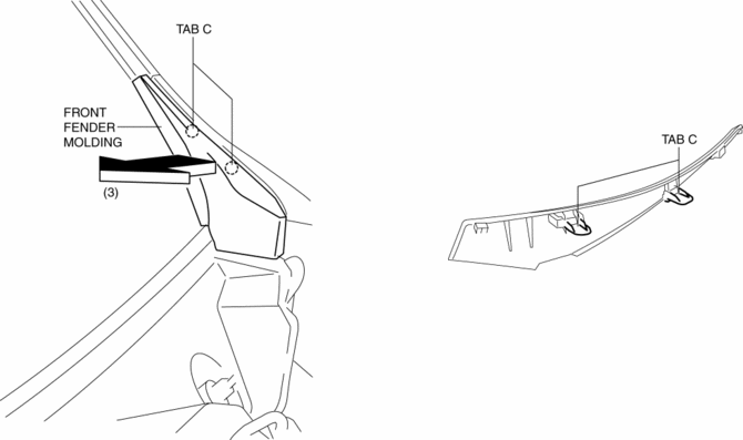 4. Pull the front fender molding in the direction of the arrow (3) and remove it while detaching tab C.