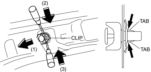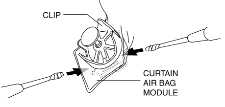 3. While pulling the curtain air bag in the direction of the arrow shown in the figure (1), detach tabs by prying with a flathead screwdriver in the direction of the arrow (2) (3).