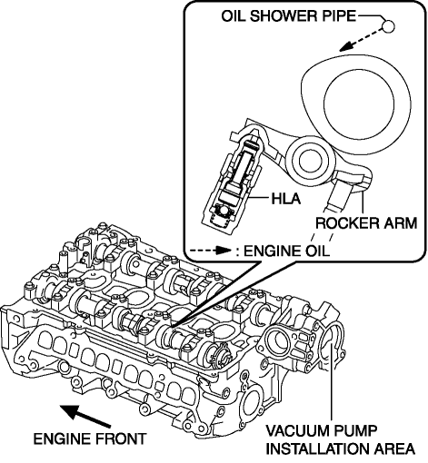 The contact point of the rocker arm and cam is lubricated by the engine oil injected from the oil shower pipe.