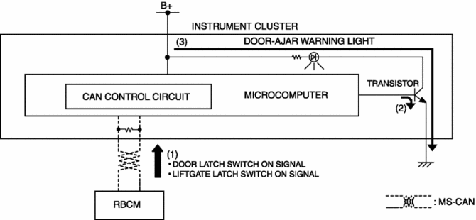 The instrument cluster controls illumination on/off of the door-ajar warning light using the instrument cluster microcomputer based on the door latch or liftgate latch position signal from the rear body control module (RBCM).
