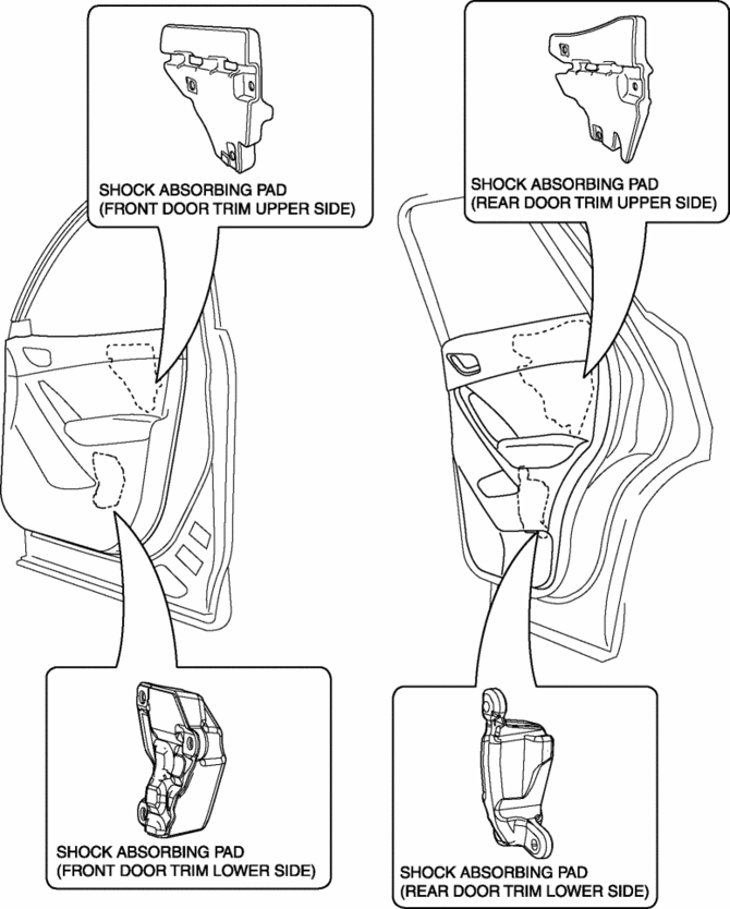 The front and rear door trims are equipped with shock absorbing pads for impulse force relief during a collision.