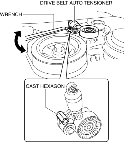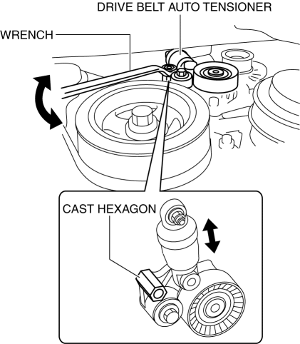 The drive belt auto tensioner is operated in the direction of the arrow by turning the wrench.