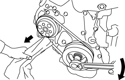 The rib of the drive belt can be slid from the groove of the water pump pulley by rotating the crankshaft pulley while pulling the cloth in the direction of the arrow.
