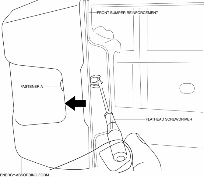 4. Insert the flathead screwdriver shown in the figure, push fasteners A for back side of front bumper reinforcement arrow shown in the figure.