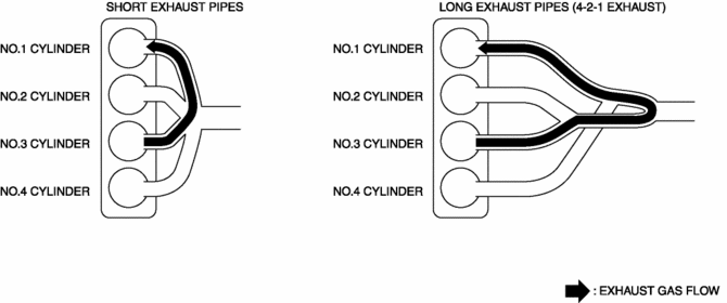 When the No.1 cylinder is at the intake stroke, the No.3 cylinder is at the exhaust stroke. By inducing the high temperature gas exhausted from the No.3 cylinder into the No.1 cylinder, the high temperature gas in the No.1 cylinder remains. If the amount of residual gas is high, the temperature in the combustion chamber rises and knocking can easily occur. With the 4-2-1 exhaust system, the transmission of exhaust pressure waves between each cylinder is delayed by the long exhaust pipes.