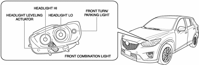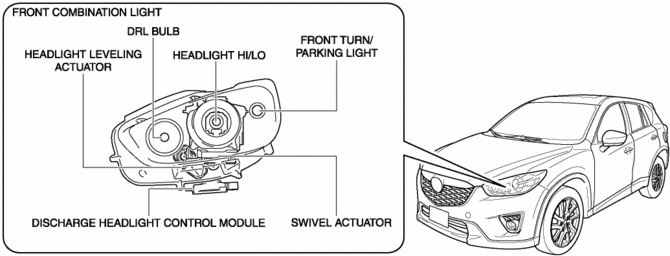 Parts related to the front exterior lights are grouped and housed together such as the headlight, front turn/parking light, headlight leveling actuator, wiring harnesses, and connectors.