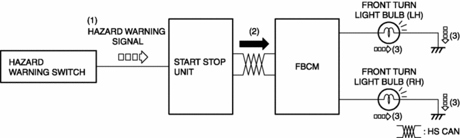 3. When the front body control module (FBCM) receives the hazard warning signal, the front turn lights (RH) and (LH) flash.