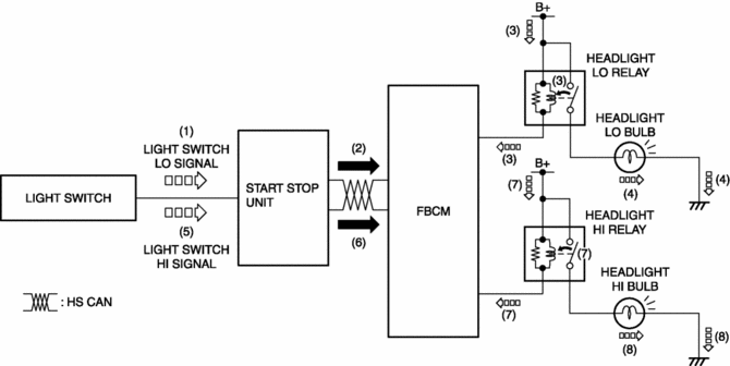 The start stop unit sends the light switch HI signal to the front body control module (FBCM) as a CAN signal.