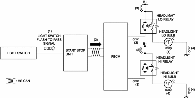 When the front body control module (FBCM) receives the light switch passing signal, it turns the headlight LO and HI relays on.