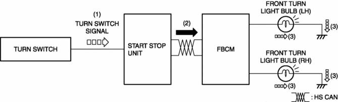 3. When the front body control module (FBCM) receives the turn switch LH or RH signal, the front turn light bulb (LH) or (RH) is illuminated.