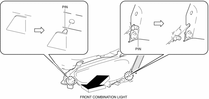 9. Pull the front combination light in the direction of the arrow shown in the figure and pull out the front combination light pin from the body.
