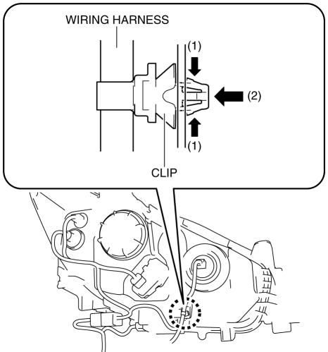 4. While pressing the clip tab in the direction of the arrows (1) shown in the figure, press the clip in the direction of the arrow (2) shown in the figure to detach the clip tab and front combination light (LH of discharge type).