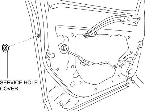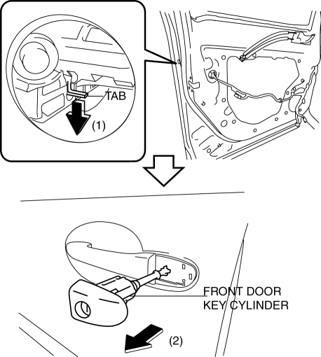 4. While pressing the outer handle bracket tab in the direction of arrow (1) shown in the figure, pull the front door key cylinder in the direction of arrow (2) to detach the outer handle bracket and the front door key cylinder.