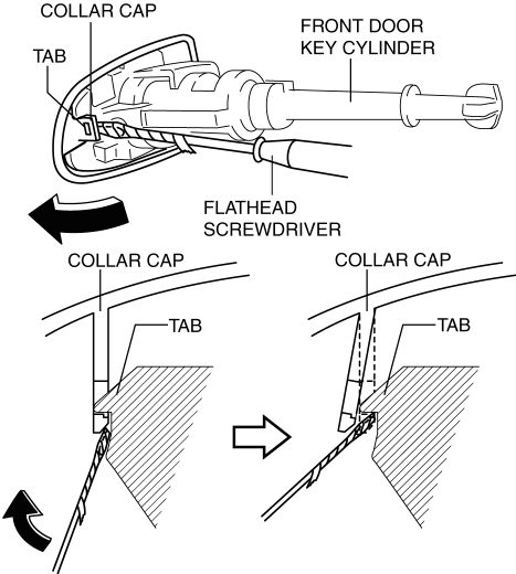 7. Move the tape-wrapped flathead screwdriver in the direction of the arrow shown in the figure to lift up the collar cap, and detach the collar cap from the front door key cylinder tab.