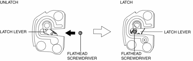 When inspecting the latch side of the front door latch switch, press in the latch lever using a flathead screwdriver and set it to the latched position.
