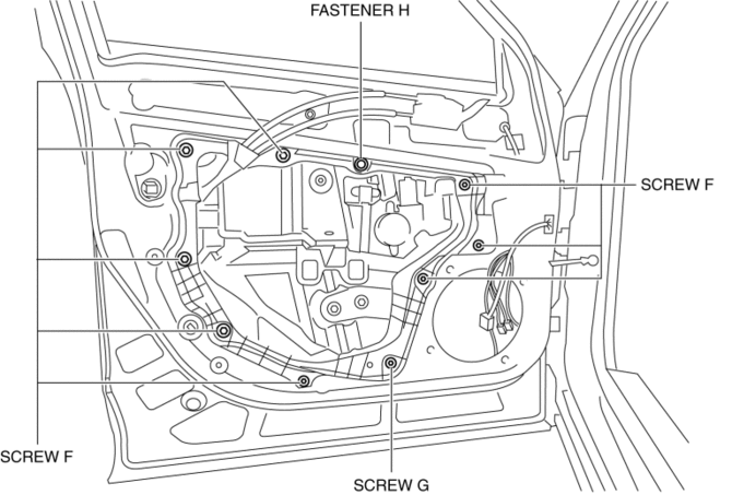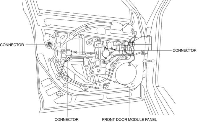 If the front power window regulator contacts the front door inner panel during the front door module panel removal, the coating film on the front door inner panel may get scratched, and the front door module panel and front power window regulator could be damaged. Remove the front door module panel while verifying that the front power window regulator and the front door inner panel do not contact each other.