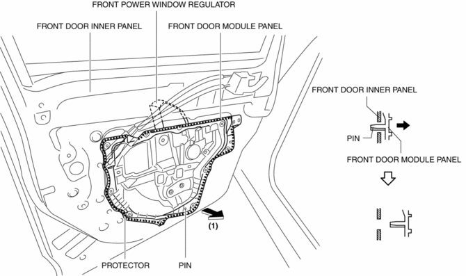 10. Pull the front door module panel in the direction of arrow (1) shown in the figure and remove the protector and pin from the front door inner panel.