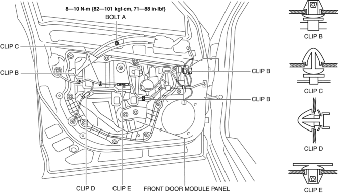 5. Detach front door wiring harness securing clips B, C, D and E.