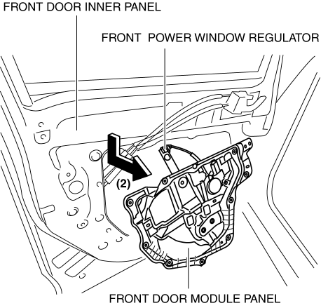 11. Move the front door module panel in the direction of arrow (2) shown in the figure so that the upper part of the front power window regulator does not contact the front door inner panel, and remove the front door module panel and the front power window regulator as a single unit.