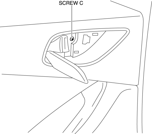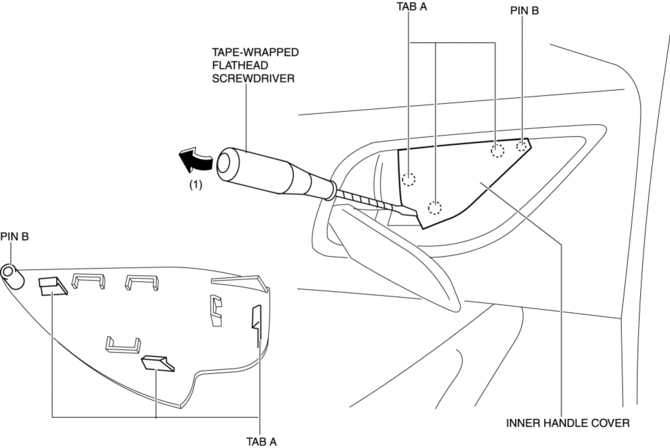 3. Insert a tape-wrapped flathead screwdriver in the position indicated by the arrow (1) in the figure and remove the inner handle cover while detach tabs A, pin B.