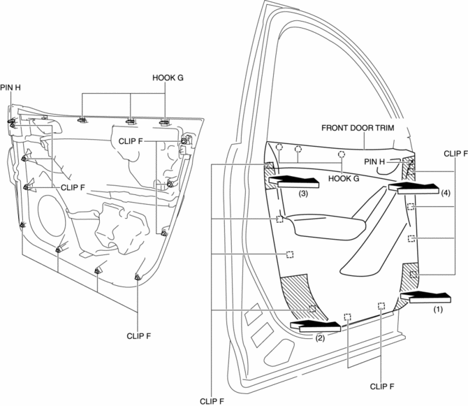 6. Take the shaded area shown in the figure, and pull the front door trim in the direction of the arrow in the order of (1), (2), (3), (4) while detaching clips F, hooks G and pin H.